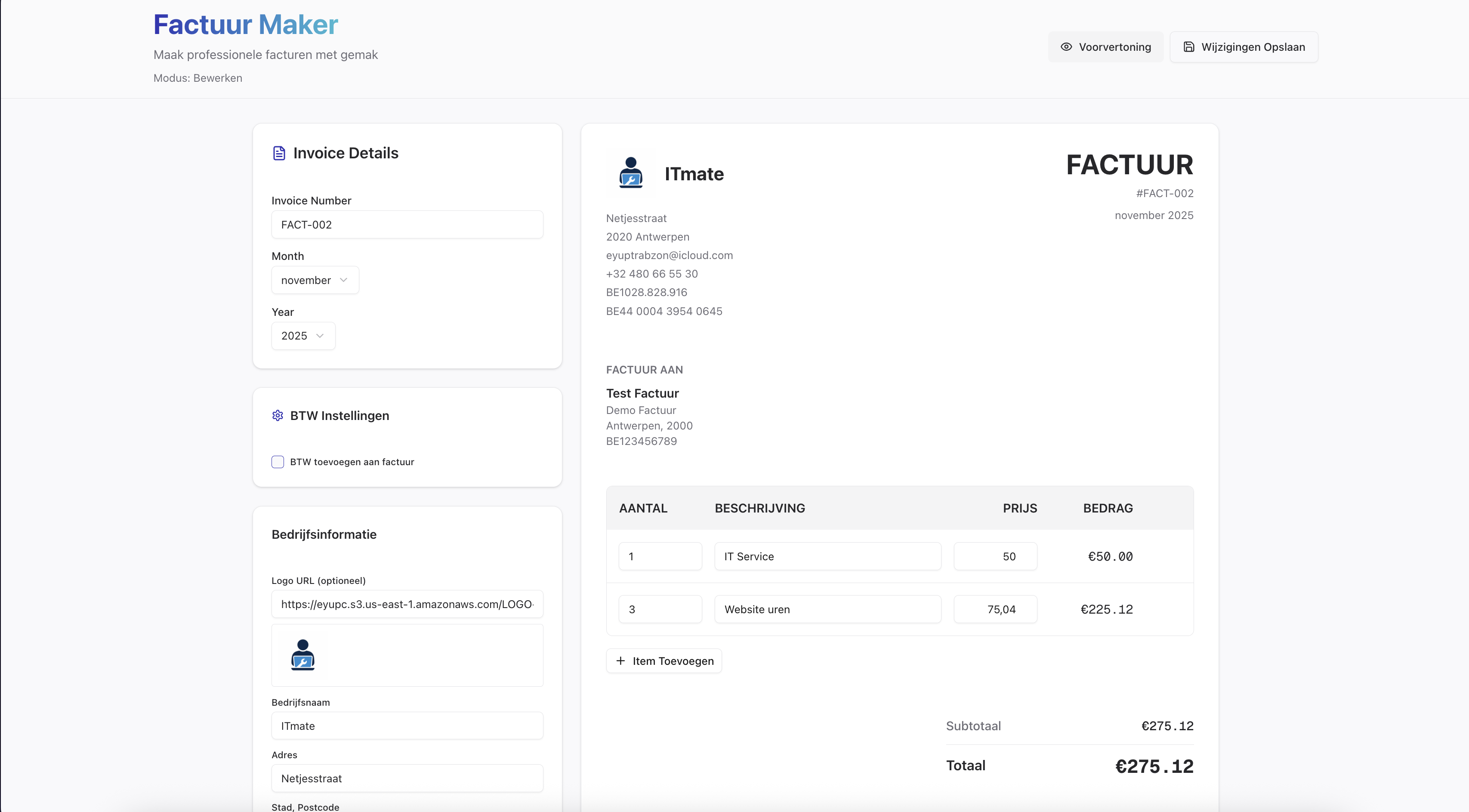 Een webgebaseerde facturatieapplicatie waarmee gebruikers professionele facturen kunnen aanmaken en beheren. De applicatie biedt functionaliteiten voor het toevoegen van artikelen, aanpassen van bedrijfsinstellingen, gebruikersbeheer met rolgebaseerde toegang en authenticatie. Facturen kunnen direct vanuit de webinterface worden geconverteerd naar PDF, met een identieke lay-out als de webweergave voor consistente professionele presentatie.